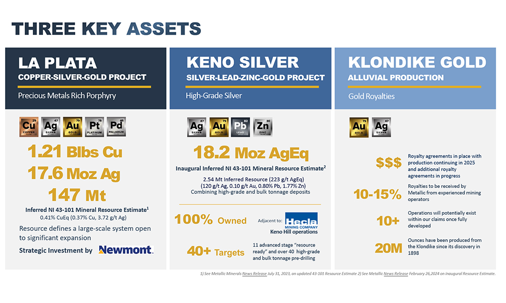 Metallic Minerals is also one of the largest owners of alluvial gold mining claims in the Yukon Territory and we are building a portfolio of Au royalties in the historic Klondike Gold District. The company has realized royalty revenue from alluvial Au production in 2023 and 2024 and is seeking new operators for its significant additional claim holdings with royalty revenue expected to increase in 2025.