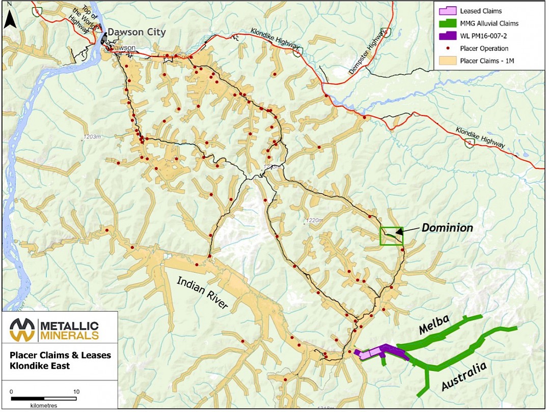 Metallic Minerals holds a 100% interest in 37.8 square kilometers of highly prospective alluvial ground along the Australia Creek and Dominion Creek drainages south of Dawson City, Yukon. Dominion Creek is a long-established gold-producing area, while Australia Creek has been recognized by the Yukon Geological Survey as the eastern continuation of the prolific Klondike Goldfields, the Yukon’s largest placer gold-producing region (see Figure 1).