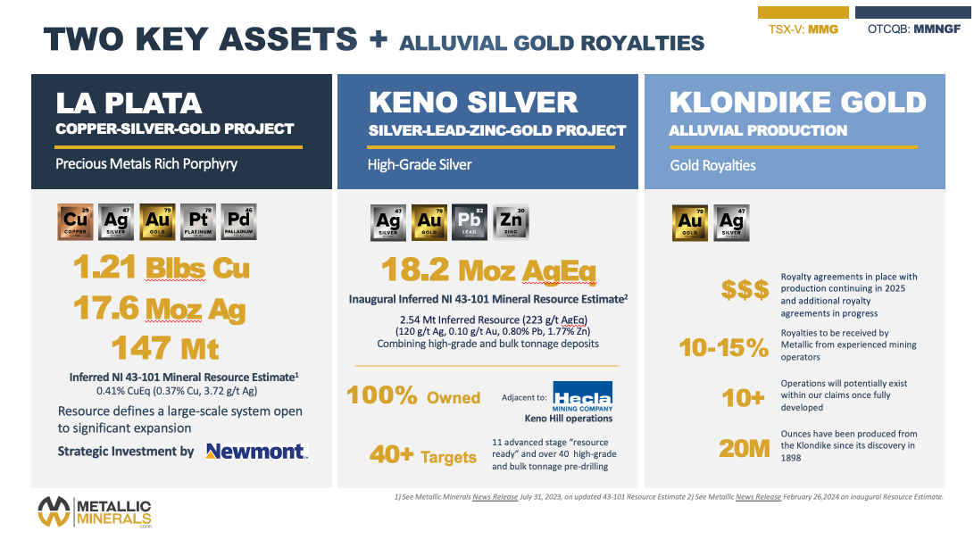 - Metallic receives a 10-15% production royalty from experienced mining operators.