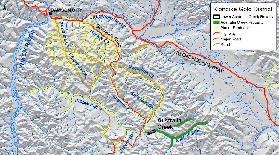 Australia Creek is part of the historic Klondike gold district that is estimated to have produced over 20 million ounces of gold since its discovery in 1898. Australia Creek and its benches are now recognized by Yukon Geological Survey as an eastern continuation of the highly-productive Indian River drainage, which is the largest placer gold producing area in the Yukon. Mining on the Indian River began in the late 1970s and has produced about 250,000 ounces or more than 40% of all placer production in the Yukon through 2015. With the expansion of larger-scale, open-pit operations, production on the Indian River has doubled since 2010 and accounted for 46% of the Yukon’s total placer gold production in 20151.
