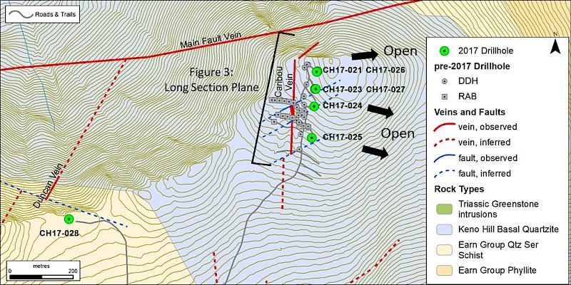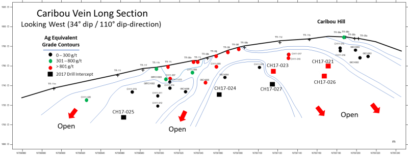 The drilling further shows that the Caribou structure is open to expansion and there remains significant exploration upside with the potential to develop a resource on this target (see long section in Figure 3 below). Drill holes are shown, with their respective grades, where they pierce the plane of the vein. Planned work for 2018 would include a continuation of step-out drilling of the shallow-dipping vein along the best mineralized shoots to the north and to the south where the high-grade mineralization remains open.