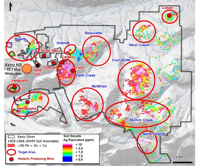 - The presence of significant Keno-style silver mineralization, including eight separate multi-kilometer targets with highly-elevated silver, lead and zinc in soils and multiple high-grade rock samples over 1,000 g/t silver; and