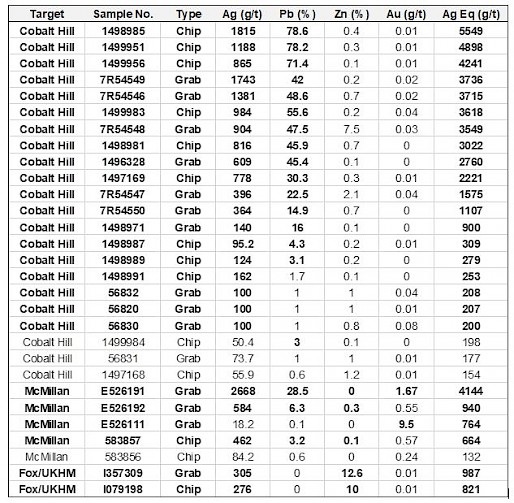 A total of 235 rock samples were collected during the 2018 field season. Highlights from 2018 and historic rock sampling at the key target areas of the East Keno area are shown in Table 1 below. Sample grades above 100 g/t Ag, 10% Pb and 200 g/t Ag Eq are bolded as significant anomalous reconnaissance values.