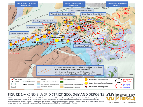 Greg Johnson, President and CEO, stated: “Following our key acquisitions in the Keno Hill silver district in 2017 and 2018 we have continued to integrate the extensive historic exploration data covering the district along with our new geochemical and geophysical surveys in order to prioritize targets for step-out and first-stage drill testing following a systematic approach to exploration. Our objective, through the integration of surface sampling, mapping, modelling of drilling and geophysics, along with multi-spectral imagery, is to rapidly advance the most prospective targets to drill testing and the development of new mineral resources in this proven, brownfields district. The Formo and Silver Queen advanced stage target areas occur along known productive structural corridors that host some of the largest deposits in the district and have the potential to quickly advance to the resource stage with additional drilling. In addition, the work at the Duncan Creek target area has quickly developed a significant surface anomaly on trend with several important productive structures. Metallic Minerals is well funded to be able to complete the next major milestones on our strong portfolio of projects and we look forward to reporting on additional work from the Keno Silver project, as well as the pending results from our recent La Plata project field programs.”