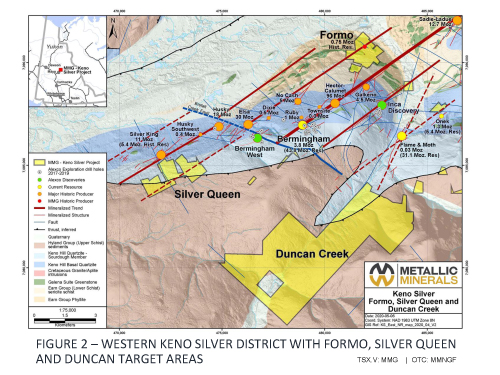 Figure 2 - West Keno Targets at the Keno Silver Project, showing the Formo, Silver Queen, and Duncan Creek target areas in relation to historic mines and new resources in the Keno Hill silver district