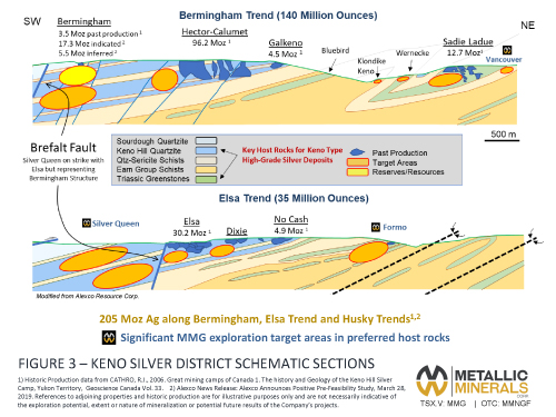 The largest deposits in the district are hosted primarily in the Keno Hill quartzite and Triassic greenstones along major structural corridors where the structural setting allows for the development of significant Keno Hill type high-grade silver-lead-zinc rich vein deposits. The schematic section shown on Figure 3 below, illustrates the major deposit locations along the Bermingham and Elsa trends, two of the most productive structural corridors. This figure also shows the similarity of the Silver Queen and Formo target areas to the stratigraphic and structural settings at the Bermingham and Sadie Ladue deposits.