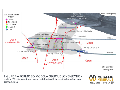 Recent modelling of results at Formo by Metallic Minerals have integrated the surface, underground and drill related sampling into a 3D geologic model along with high-resolution orthophotography, multi-spectral studies and newly interpreted geophysical surveys covering the area. Figure 3 highlights the mineralized shoots at the Formo deposit in long section view. Between the open-pit surface exposures and the 2600 level drift, the vein has been delineated by channel sampling from underground drifts and drilling for approximately 100 meters vertically and 200 meters laterally. This modelling reveals at least three well-defined mineralized shoots of high-grade silver grading over 1,000 g/t silver. These mineralized shoots remain open to expansion at depth and along strike and extensions of these shoots will be the focus of future drilling (see Table 1 and Figure 4).