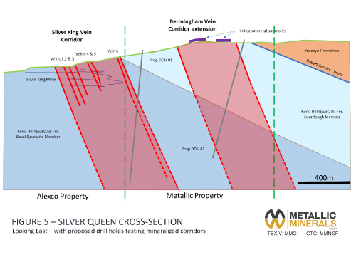Modelling at the Silver Queen target area by Metallic Minerals has refined two priority targets for drill testing that include the potential projected down dip extension of the high-grade Silver King deposit and the trend extension of the western Bermingham system. Both structural corridors represent significant near-term exploration targets at Silver Queen (See Figure 5 Silver Queen Cross Section).