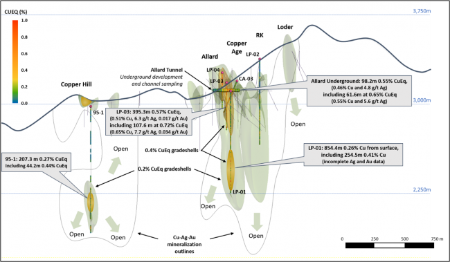 Drilling to date on the Allard zone within the central porphyry system has defined a northeast trending zone of copper-silver-gold mineralization that begins at surface and continues to a depth of at least 850 m and more than a kilometer of strike. Recent underground chip channel sampling by Metallic Minerals within the Allard tunnel has confirmed a true width of 98.2 m grading 0.55% Cu Eq. across the zone including 61.6 m grading 0.65% Cu Eq. Historical drill hole LP-03 intersected 395 m of porphyry style mineralization grading 0.57% copper equivalent (0.51% Cu, 6.3 g/t Ag, and 0.017 g/t Au) including 108 m grading 0.75% copper equivalent (0.65% Cu, 7.7 g/t Ag and 0.034 g/t Au) starting at surface with the hole ending in mineralization.