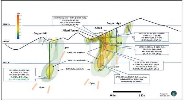 - Historical drilling by Rio Tinto, Freeport and others returned intervals in the Allard porphyry system, starting at surface, that include 395 m grading 0.57% copper equivalent (0.51% Cu, 6.3 g/t Ag and 0.017 g/t Au) in LP-03 and 854 m at 0.26% Cu including 254 m grading 0.41% Cu in drill hole LP-01, both of which ended in mineralization.