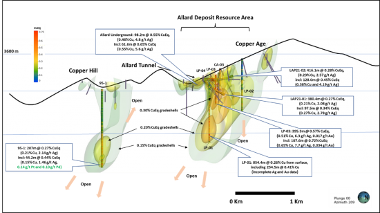- Drilling highlights at the Allard porphyry system include 395 m grading 0.57% copper equivalent (0.51% Cu, 6.3 g/t Ag and 0.017 g/t Au) in LP-03, and 854 m at 0.26% Cu, including 254 m grading 0.41% Cu, in drill hole LP-01. Both drill holes started and ended in mineralization (see Figure 1).