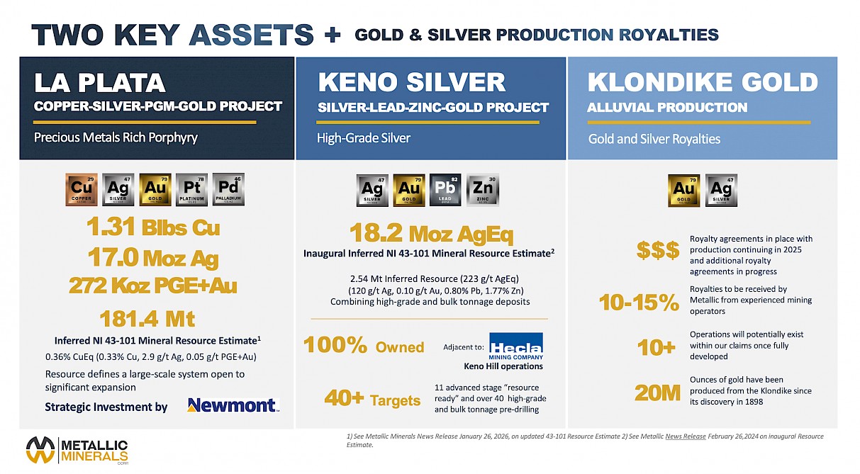 - Metallic receives a 10-15% production royalty from experienced mining operators.